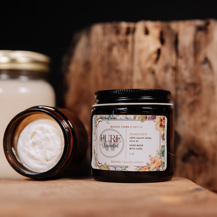 Each jar of our tallow balm is hand-rendered and hand-whipped in small batches using suet from our own pasture-raised cattle. No chemicals, no shortcuts. Just pure, nutrient-rich skincare made with care from start to finish on our farm.