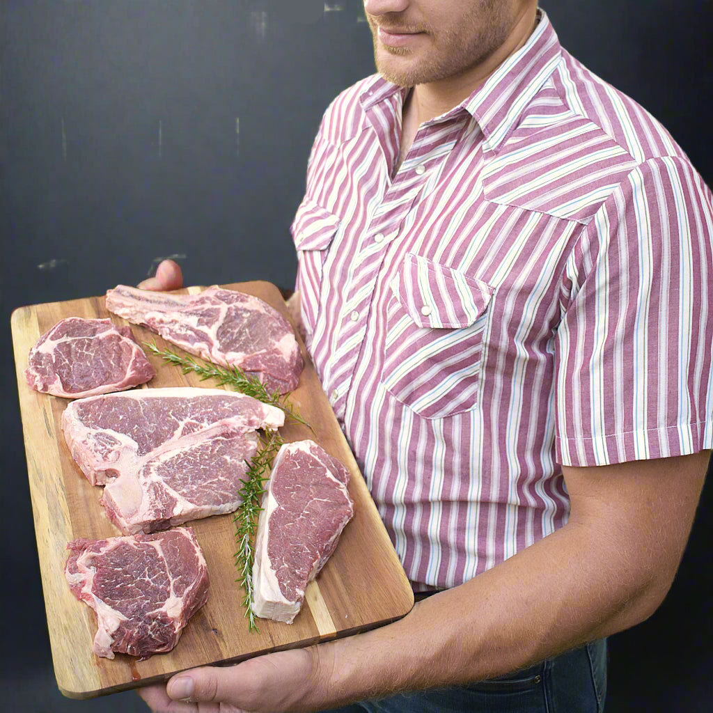 Each box includes a rotating selection of our most premium, pasture-raised steaks: thick-cut Ribeye, Filet Mignon, New York Strip or a hearty T-Bone—hand-trimmed and ready for cast iron or open flame.